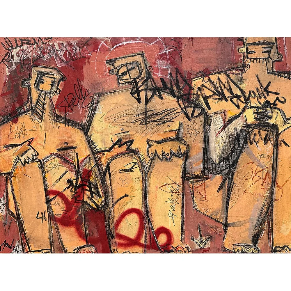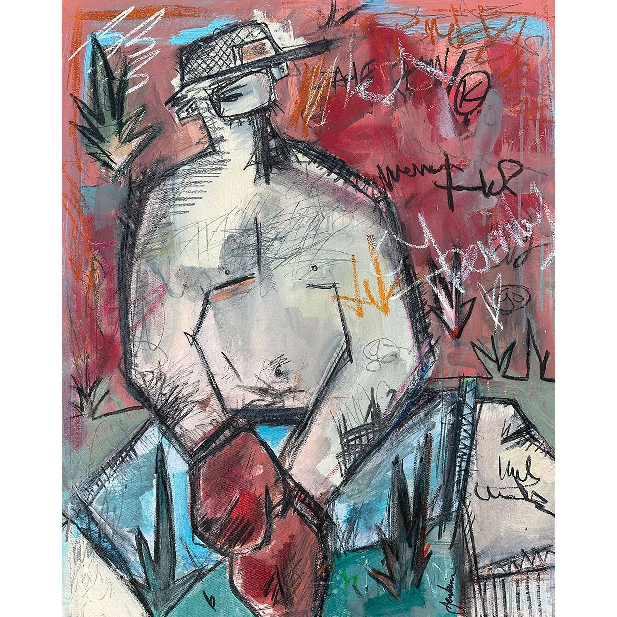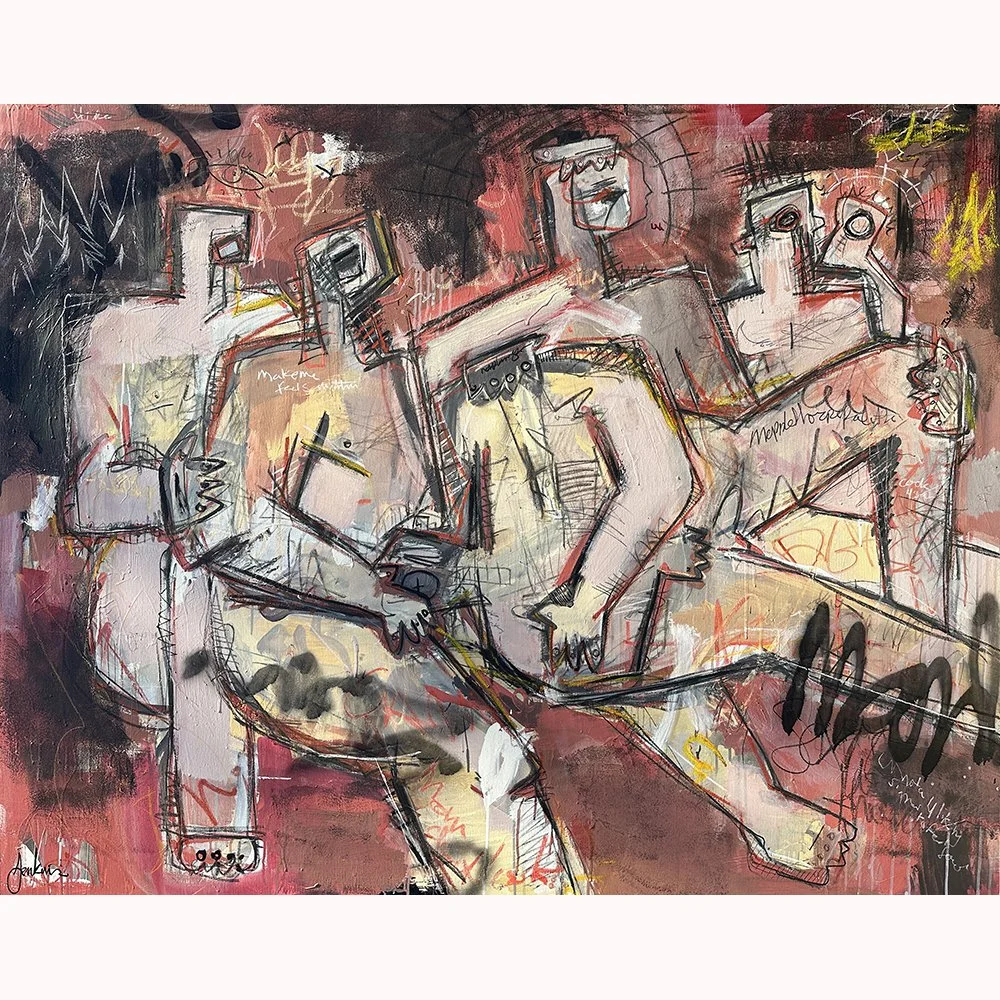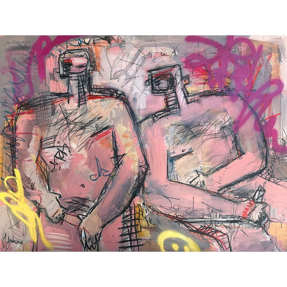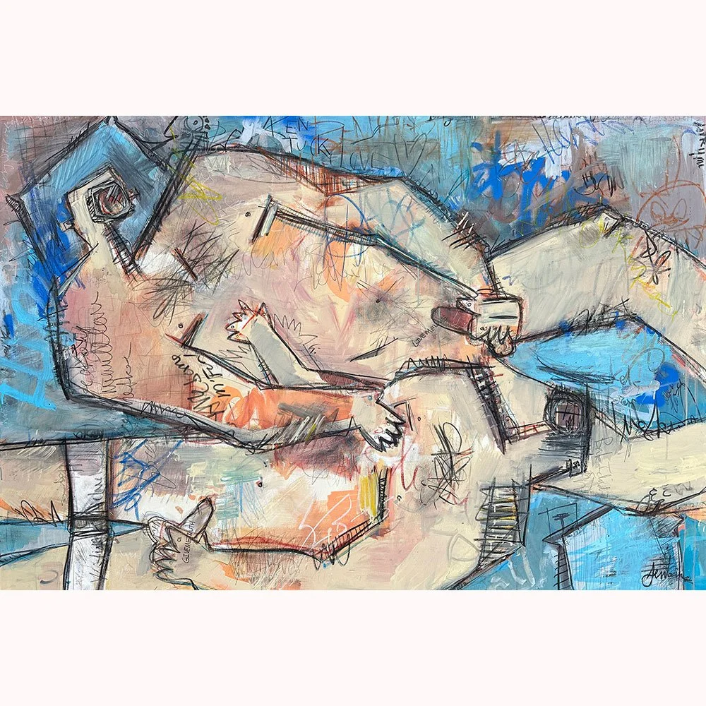 “The human figure remains central in my work, often fragmented and distorted, reflecting both personal and collective tensions of self-perception, queerness, and cultural displacement, and constructing layered narratives that explore identity, masculinity, and belonging.“