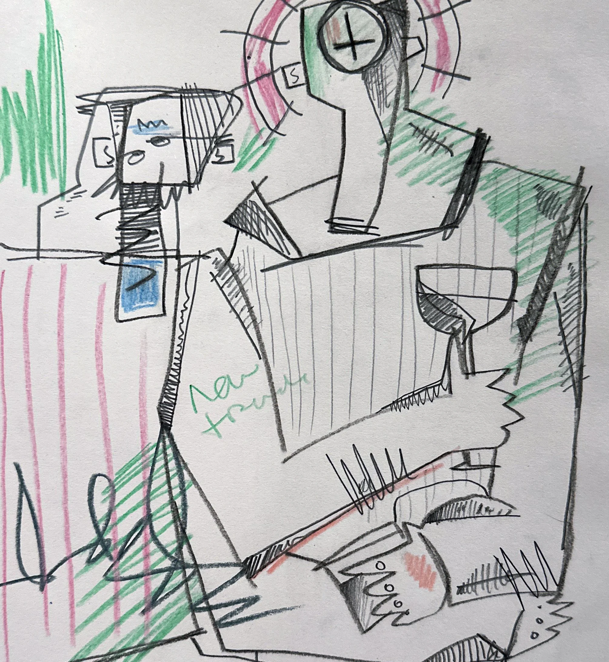 I explore masculinity as a gay man through desire, intimacy, and emotional complexity, expressed through fragmented representations of the male form shaped by psychological tension and social exchange. Drawing on deconstructed visual languages associated with Pablo Picasso and George Condo, and the immediacy of street art, I construct figures through loose, gestural mark-making and assertive line work, compressed within vivid, densely textured fields of color. Each work carries its own narrative, shaped by a compelling emotional charge.