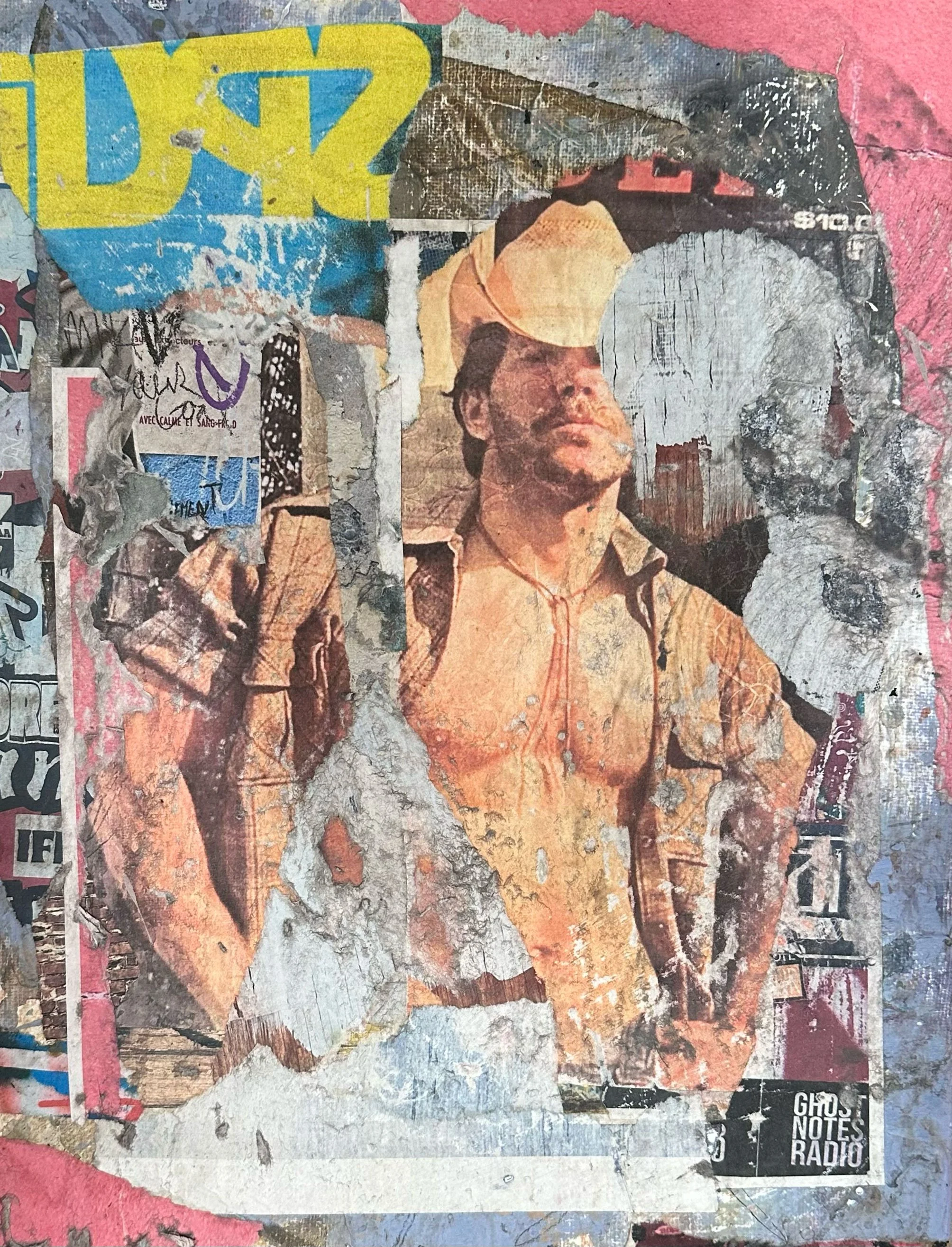In Cultural Sediments, I construct layered collages on painted grounds that evoke the weathered surfaces of urban walls. Working with repurposed vintage gay adult magazine imagery, I tear, abrade, and stain each element so that figures emerge in states of partial erosion—marked by time, environment, and cycles of removal. This process mirrors the accumulation and decay of cultural memory, tracing shifting ideals of masculinity within the gay community and the persistent nostalgia attached to earlier archetypes of the idealized male body. By translating once-private images of desire into surfaces that recall public urban remnants, the work considers how identity, beauty, and history are continually constructed, circulated, and worn away.”